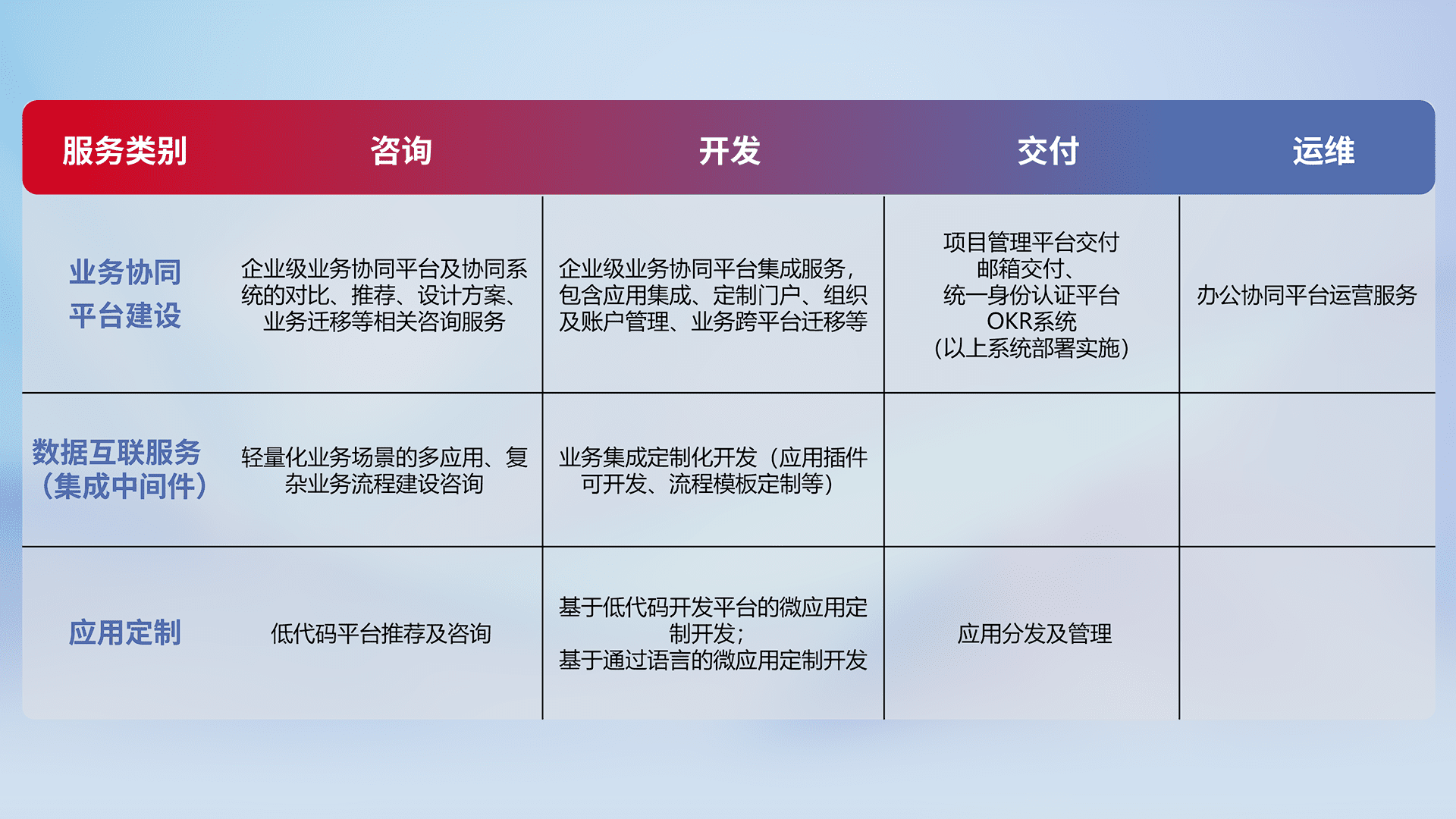 针对钉钉、、、企微、、、IDaas等平台级产品提供产品的规划、、方案、、交付、、、定制化开发等服务,,,实现如统一协同办公、、、智能客户服务、、混合会议管理、、智能数据查询、、、等业务场景,,,,实现数字化转型。。。